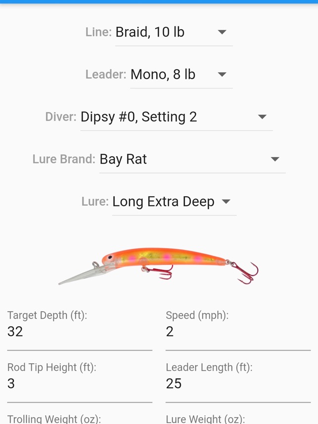 . This app lets you select your line your lure a diver or trolling weights and then combine them however you want. The question is does trolling speed. I vary speed alot when trolling both lead core and snap weights usually faster.